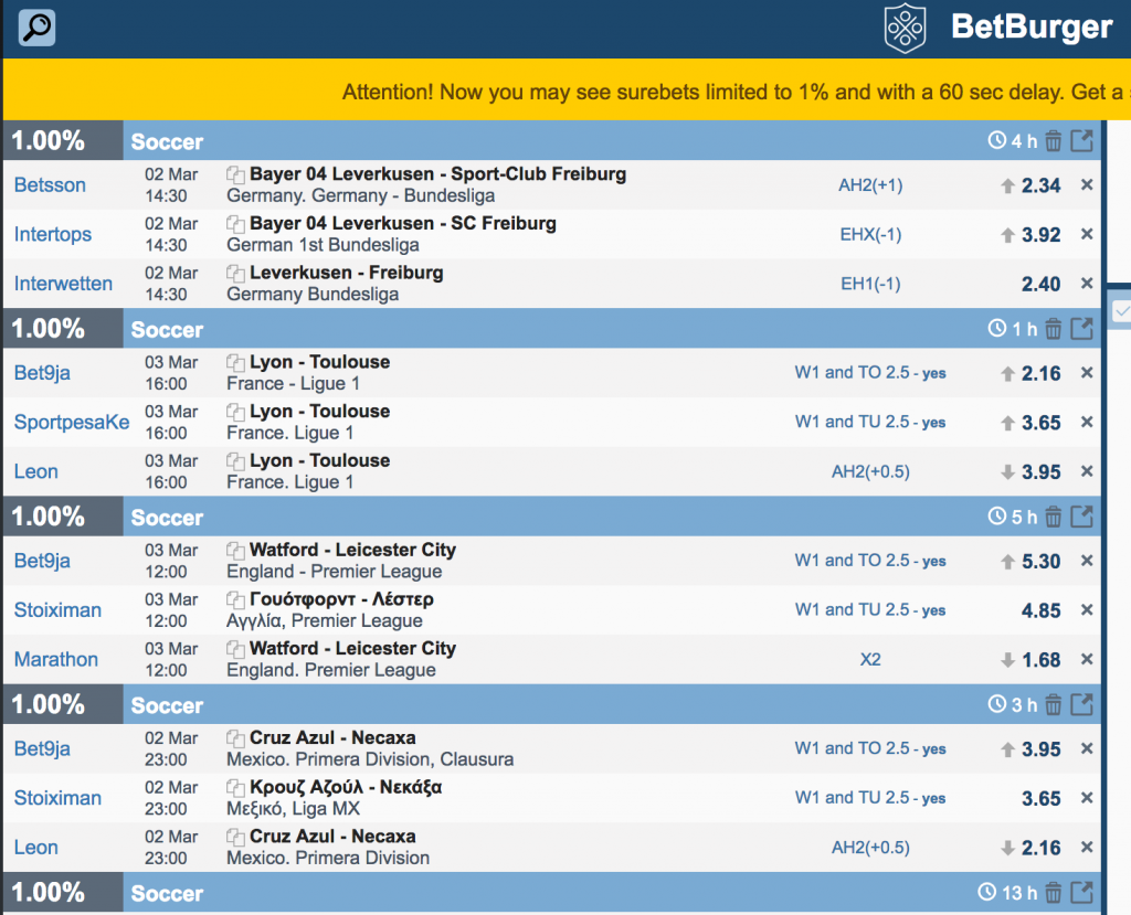 BetBurger uses a subscription model with several tiers based on data speed and market type.